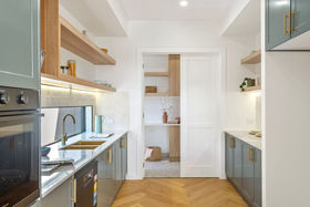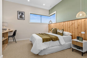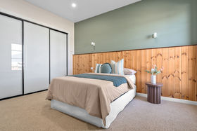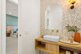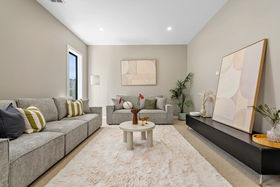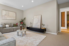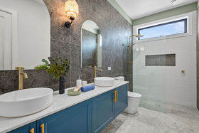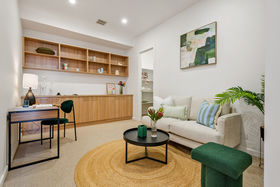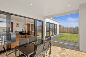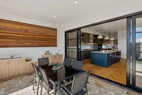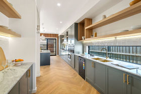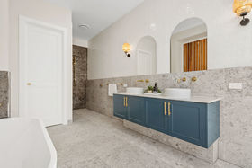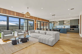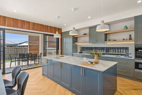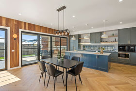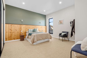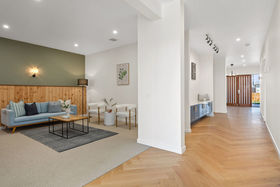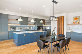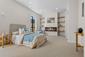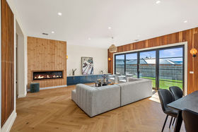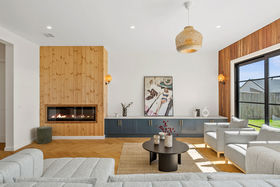 The expansive open-plan kitchen, dining, and north-facing living area features a cosy electric gas log fireplace and seamless flow to the outdoors. The chef's kitchen impresses with a 900mm ceramic cooktop, dual ovens, inbuilt microwave, New York marble island bench and soft-close cabinetry - perfectly balancing functionality with style.