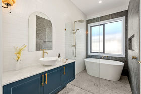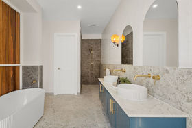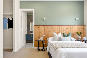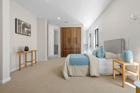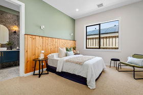 The home has been thoughtfully designed with dual master suites - both featuring walk-in robes and dual vanity ensuites. The main master includes a freestanding fluted bath, walk-in shower, and its own electric gas log fireplace, while the second master is ideal for guests or multi-generational living. Two further generously sized bedrooms with built-in robes are serviced by a central bathroom and separate powder room.